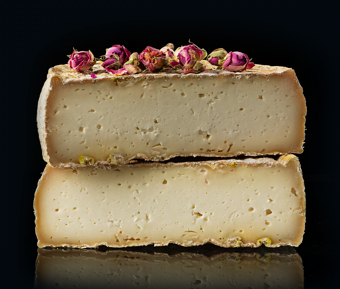 La forma viene salata a secco in superficie e stagionata per un minimo di cinque mesi, in cantina, su assi di abete. L’affinamento ruota intorno al Gin. Uno spirito dalla gradazione alcolica piuttosto alta e molto aromatico, che qui tiene testa e addomestica il latte di capra. L’essenza di Rosa Damascena aggiunge un tocco di eleganza con profumi rotondi e rilassanti. I boccioli essiccati della rosa abbelliscono la faccia della forma. È un affinamento che può essere prolungato per più di un anno, condizionando il formaggio che con il passare dei mesi risulterà sempre più di carattere. Gli aromi principali che si riscontrano sono erbacei e di fungo porcino.