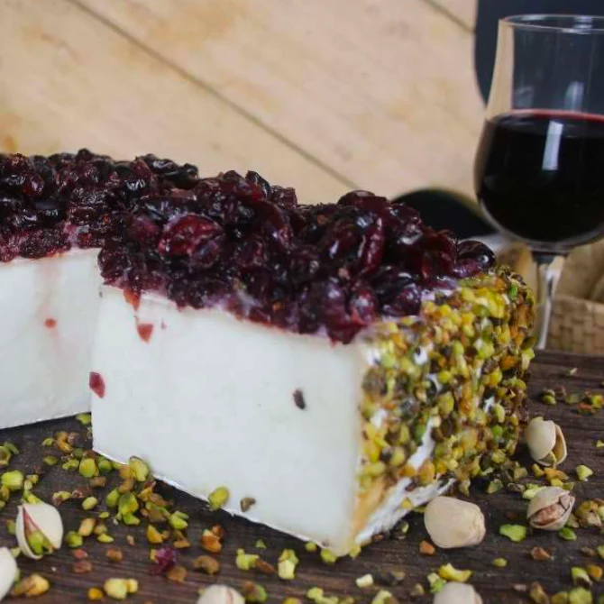Il Robiolone Fruttato è un formaggio di capra dalla forma quadrata, caratterizzato da un’affinatura con bacche di mirtillo rosso in crosta e granella di pistacchio, che esaltano i sentori dolci e speziati. La crosta bianca e vellutata racchiude una pasta morbida e fondente, dal delicato gusto di latte di capra fresco. Durante la stagionatura, la pasta tende a cremificare, accentuando l’intenso aroma caprino. Questo formaggio offre un’armonia perfetta tra il dolce della frutta e il profumo di bosco.